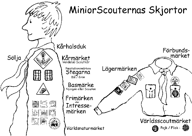 Här är placeringarna för Miniorscouternas märken på scoutskjortan.